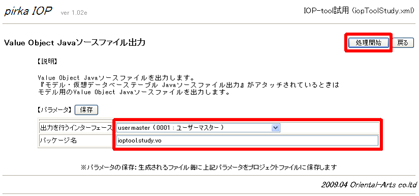 Value Object Javaソースファイル出力画面で、入力して、「処理開始」ボタンをクリック