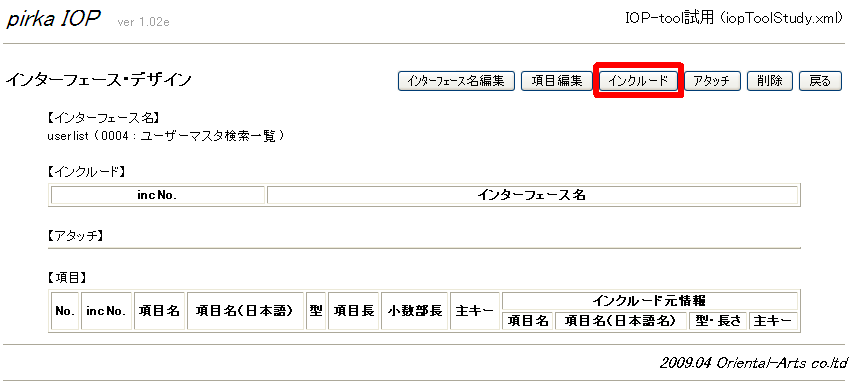 - インターフェース・デザイン画面で、「インクルード」ボタンをクリック