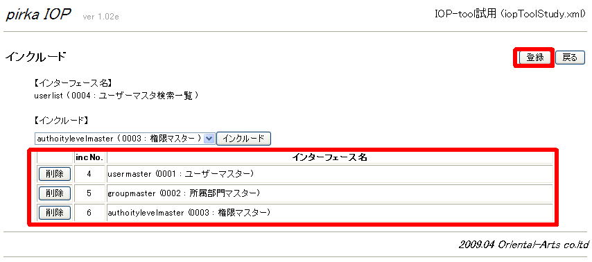 - テーブルインターフェースを3つインクルードしたら、「登録」ボタンをクリック