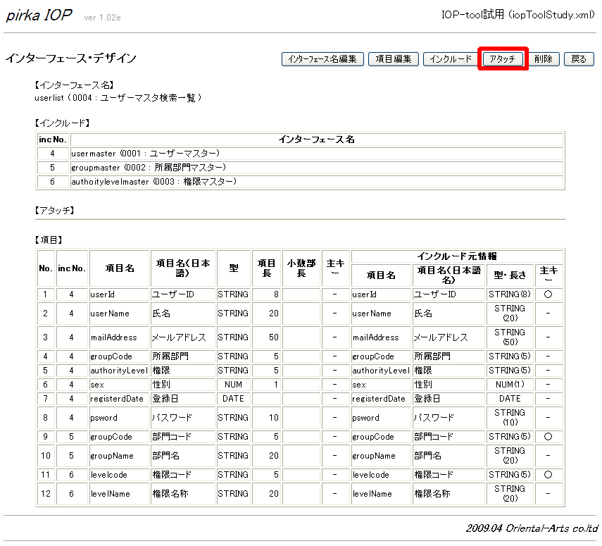 (インクルード/アタッチの方法は、検索一覧画面のインターフェースと同様)