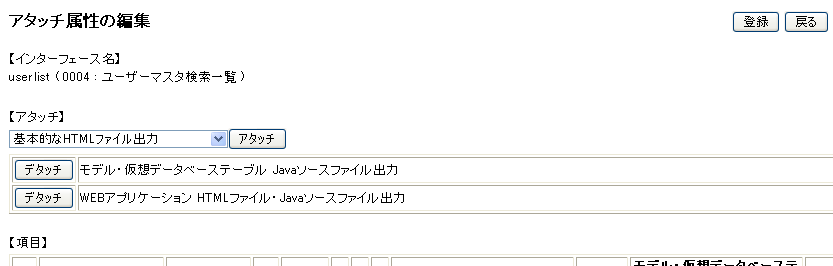 - アタッチ属性の編集画面で、選択リストから モデル・仮想データベーステーブル Javaソースファイル出力 を選択して、「アタッチ」ボタンをクリック