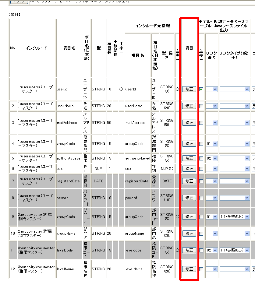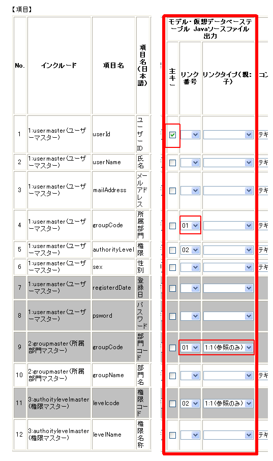 - モデル・仮想データベーステーブル Javaソースファイル出力:リンク番号&リンクタイプ