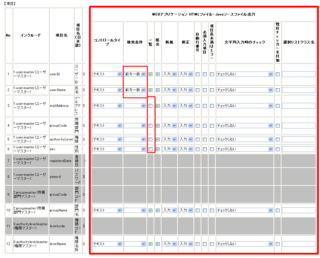 - WEBアプリケーションHTMLファイル・Javaソースファイル出力:検索条件