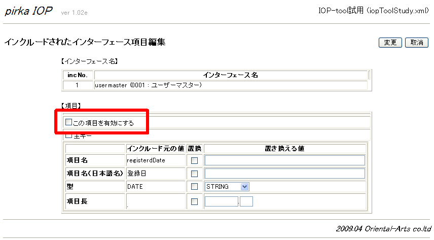 - インクルードされたインターフェース項目編集画面で「この項目を有効にする」のチェックを外す