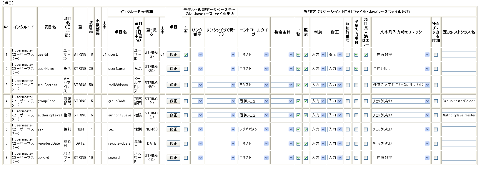 - WEBアプリケーションHTMLファイル・Javaソースファイル出力:コントロールタイプ