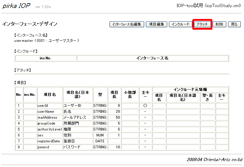 - インターフェースデザイン画面で「アタッチ」ボタンをクリック