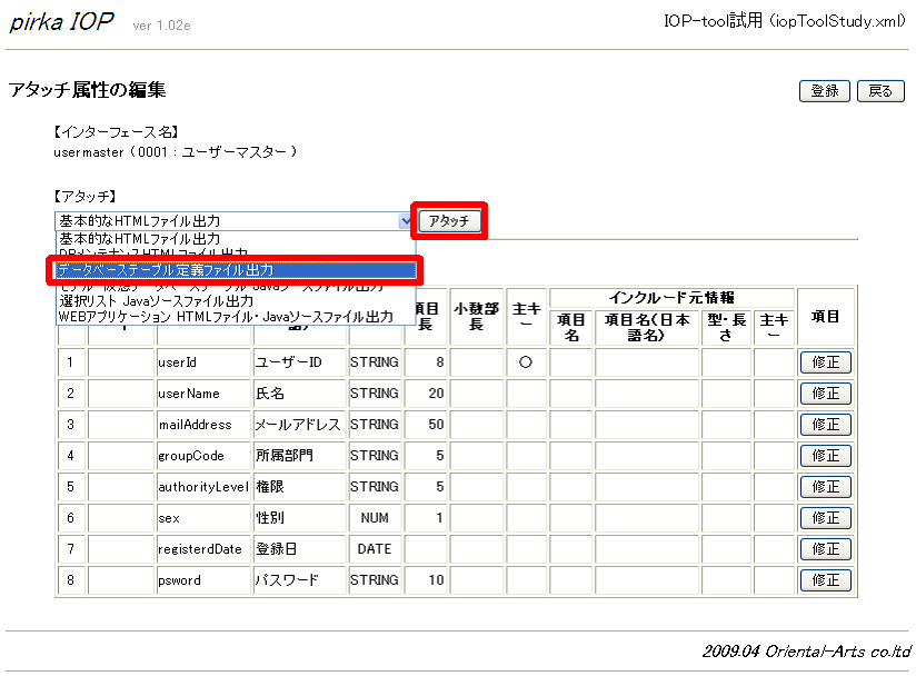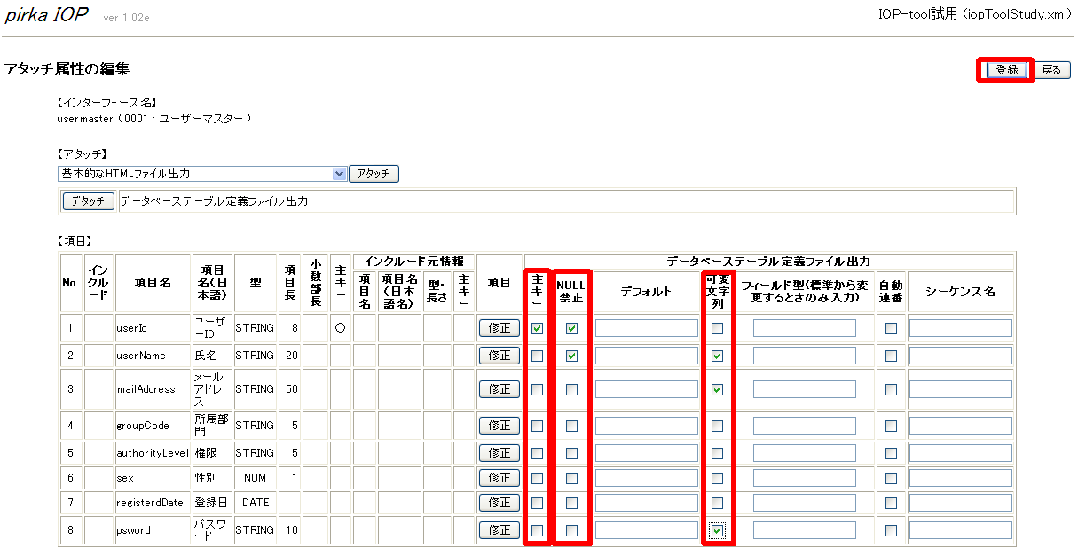 - データベーステーブル定義ファイル出力画面で、入力して、「登録」ボタンをクリック