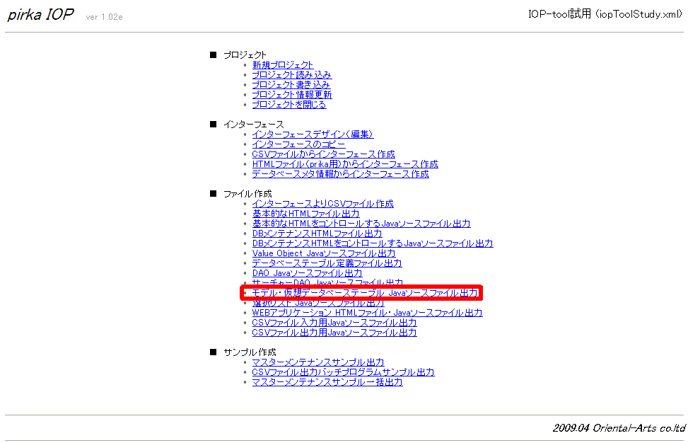 メニュー画面で、「■ファイル作成 モデル・仮想データベーステーブル Javaソースファイル出力」を選択する