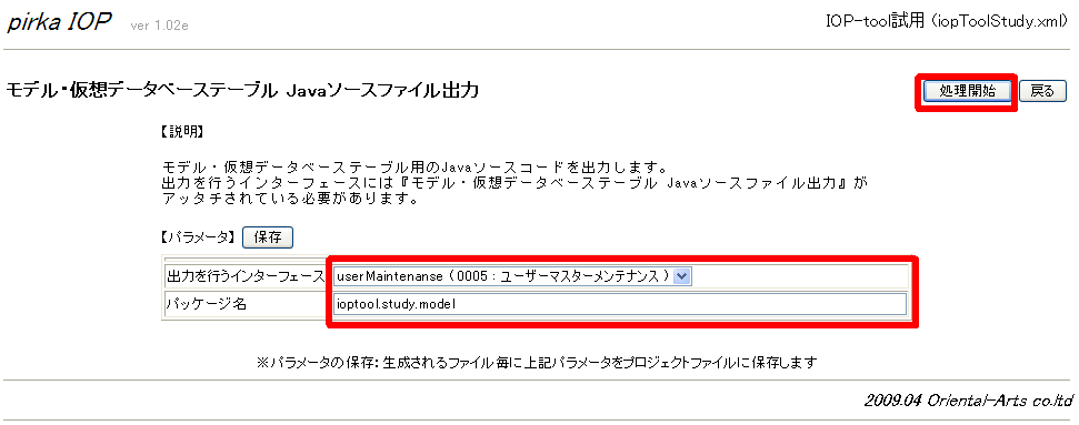 モデル・仮想データベーステーブル画面で入力して「処理開始」をクリックする