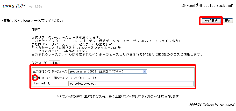 選択リストを作成するインターフェースを選択して、「処理実行」ボタンをクリックします。 複数の選択リストを作る場合、「選択リスト共通クラスソースファイルを出力する」は一度だけ出力。