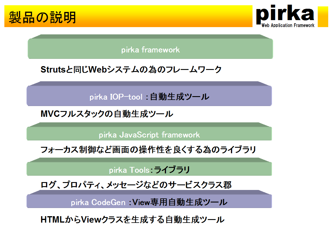 pirkaはWebシステムの開発支援ツールで、幾つかのフレームワークと幾つかの自動生成ツールで構成されています。